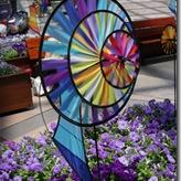 羽がカラフルなので、回ると色が融け合ってきれいです。梅雨の晴れ間で、気持ちよく晴れ上がっていますが、日射しは強く、ちょっと暑いので、無音でくるくると回っている風車たちは涼しげで目を楽しませてくれます。