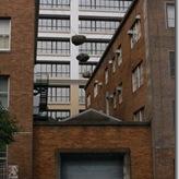 ビルとビルとの間に存在する、ガレージの上に、三つの巨大な石が、ワイヤーでつり下げられているのです。