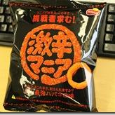 まず、最初は、フリトレーの「激辛マニア」。「挑戦者求む!」「マニアが認めたこの辛さ…。」「あなたはこの辛さ、耐えられますか?」「史上最強ハバネロ味」「この商品は大変辛いので、辛いものが苦手な方や小さいお子様には十分ご注意下さい。」などのアオリが踊っております。